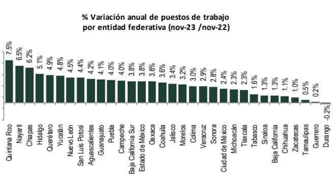 Agregó que los últimos datos del Instituto Nacional de Estadística, Geografía e Informática, demuestran que Nayarit tuvo el segundo mayor aumento de empleo a nivel nacional durante el pasado mes de noviembre, con respecto al mismo periodo de 2022: un crecimiento del 6.5%.