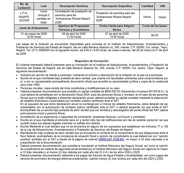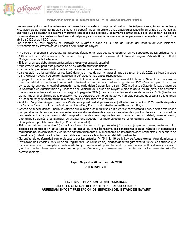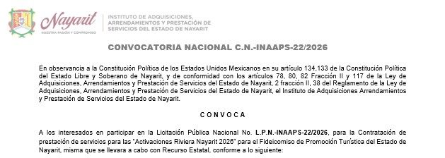 Gobierno CONVOCATORIA C.N.-22-L.P.N.-INAAPS-22-2026 Por Oscar 26 marzo, 2026 0 24 Cuota FacebookTwitterPinterestWhatsApp Artículo anteriorAlto nivel en el Tour Mundial de Voleibol de Playa Challenge Nayarit 2026Artículo siguiente Artículos relacionados Gobierno Gobierno del Estado refuerza acciones coordinadas para mantener la paz y la seguridad en Nayarit 26 marzo, 2026 Gobierno 26 marzo, 2026 Gobierno El Croquetón DIF Nayarit ya comenzó 26 marzo, 2026