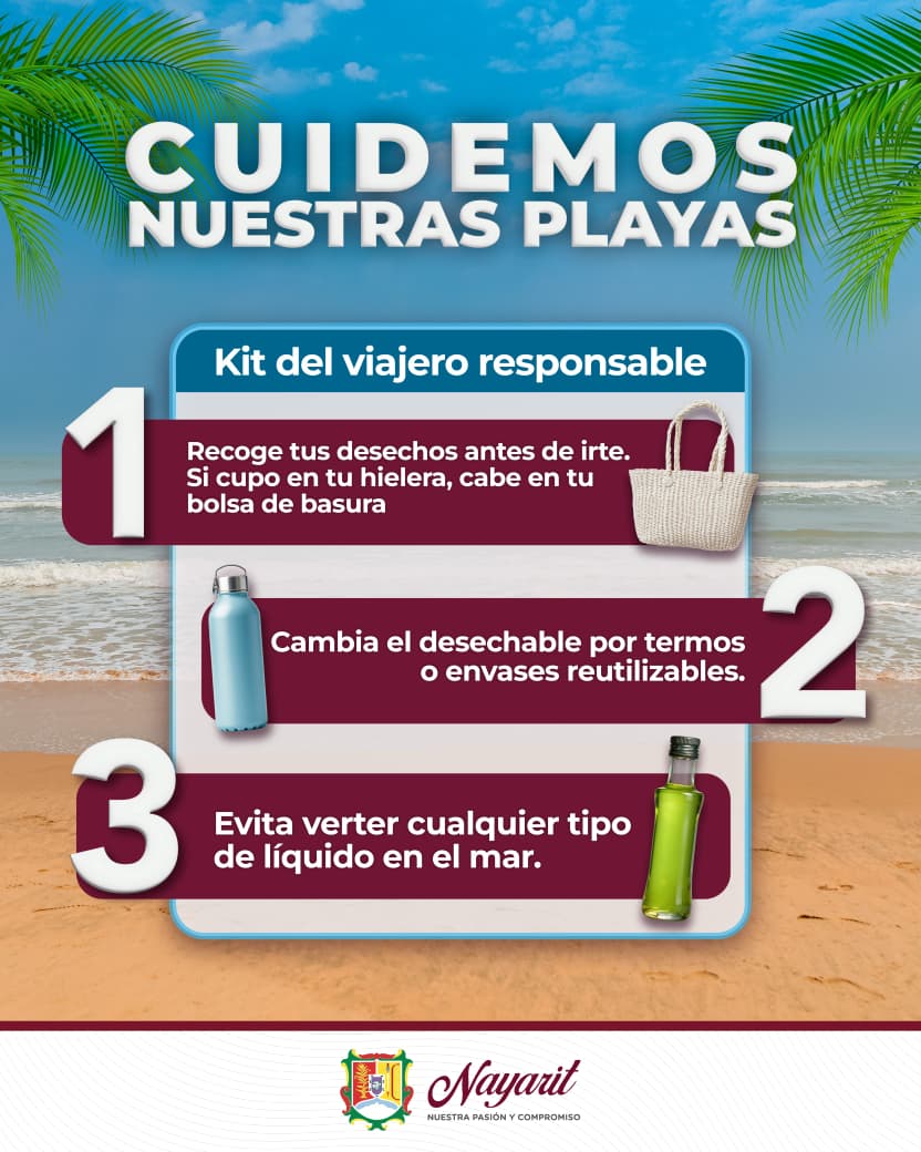 Cuidar y disfrutar de las playas y destinos turísticos es tarea de todas y todos, por ello; desde el Gobierno del Estado te invitamos a disfrutar responsablemente: recoge tu basura, utiliza envases reutilizables y evita contaminar el mar.